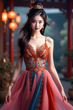The Chinese beauties wore a mysterious semi-transparent and hollowed-out colored gauze skirt, with exquisite lace patterns inlaid, showing the perfect combination of oriental charm and modern sexiness. Her long black hair drooped gently, her eyes were gentle and confident, and her standing posture was elegant. High-definition photography, full body image, soft light and shadow, highlighting the outline of the character and the details of the clothing, 8K.,Stained glass mosaic,Ancient Han costume,A gauzy skirt