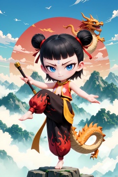 LZNZ,1BOY, full body,A round face with expressive large eyes, topped with short black hair styled in two small buns. dressed in a traditional Chinese hairstyle and costume, is holding a weapon and doing martial arts moves, mostly in 3D style, The background is the Chinese dragon, accounting for most of the picture, the dragon hidden in the picture of auspicious clouds, atmosphere, majestic, ink style, as well as mountains, clouds, watercolor, ink painting,
