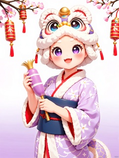 SNIP, The background is white, Here is a lavender snake wearing a traditional Japanese yukata. The snake has soft, dreamy eyes and a calm smile, clutching a delicate porcelain vase painted with cherry blossoms in its left hand. The yukata features navy blue sashes, and displays a lavender and gold wave pattern, complemented by white cranes.