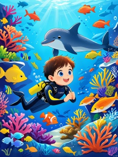ETHB,Child insertion, A digital page from a children's book about underwater adventures. A diver boy swims alongside a playful dolphin, both wearing scuba gear. The ocean is teeming with colorful fish and coral reefs in a soft blur. The boy's eyes are wide with amazement, positioned near the center of the frame. The background fades into a deep blue expanse, emphasizing the wonder of the underwater world. The aesthetic is vibrant, with contrasting colors and a sense of excitement. It combines digital illustration with an underwater adventure theme.