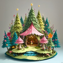 pop-up book, A whimsical woodland fairy village with tiny cottages and colorful flowers. In the foreground, fairies danced and sang, while in the background, towering trees created a protective canopy. The scene was a magical, enchanting retreat from the outside world.