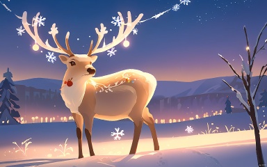 HCCH, A serene snow-covered landscape at dawn. In the foreground, a reindeer stands proudly, its antlers adorned with twinkling fairy lights. Snowflakes gently fall around it, casting a soft glow in the dim morning light. The background is apanse of pristine snow, with the first rays of sunlight casting long, ethereal shadows on the horizon.