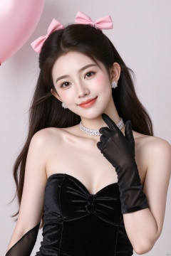 Realistic photo, 1girl, solo, long hair, looking at viewer, smile, simple background, black hair, gloves, dress, bow, bare shoulders, jewelry, collarbone, earrings, black gloves, artist name, black eyes, black dress, lips, strapless, strapless dress, realistic, balloon, heart balloon