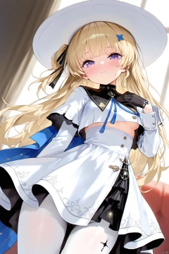 good work, (best quality), illustration, depth of field, (color),masterpiece,best quality,petite,cute,loli, kawaii,1girl, solo, long hair, breasts, looking at viewer, blush, bangs, blonde hair, hair ornament, gloves, long sleeves, hat, dress, closed mouth, purple eyes, black gloves, white dress, underboob, white headwear, hand on own chest,white pantyhose,waist,leg Tattoos,phoebe