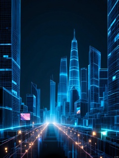 QXXG, a holographic metropolis soaring above a sea of darkness. Towering skyscrapers, their facades pulsing with vibrant, digital patterns, stretch into the infinite black sky. The streets below are empty, save for floating, holographic advertisements and the occasional spark of neon light.