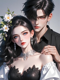 BDZC, Anime-style digital artwork of a couple, featuring a woman with long black hair adorned with floral accessories, wearing a black lace dress with intricate details and a white off-the-shoulder top. She has fair skin, large eyes, and red lips. Behind her, a man with short black hair and fair skin is looking down at her, wearing a black shirt. The background is a simple, light gray color. The style is detailed and realistic, with a focus on the emotional connection between the characters.