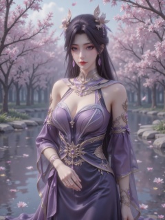 A charming Asian woman with dark purple hair, wearing a purple strapless dress, purple high heels, gold bracelets and gold rings. She wore a purple necklace and earrings, adding a touch of glory to her outfit. Her eyes were dark blue, her lips were light red, with light red eyeshadows, and a mark on her face. The surrounding environment is full of dreamy atmosphere, pink branches stretch out from one side, petals floating on the water surface, white flowers blooming by the water, and the light and shadow on the background create a mysterious and romantic feeling. The overall picture is like a scene in a fairy tale , perfectly blending the beauty of women with dreamy natural elements,zichu,Beautiful and dreamy