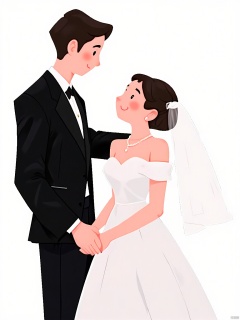 RWYS, A digital illustration of a bride and groom holding hands, standing facing each other. The bride is wearing a white wedding dress with a long veil, and the groom is in a black suit with a white shirt and black tie. The background is plain white. The style is simple and clean, with smooth lines and soft shading. The bride's hair is styled in an elegant updo, and she is smiling warmly. The groom is looking at the bride with a gentle expression. The overall mood is romantic and happy.