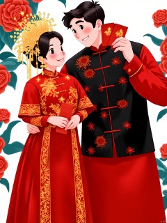 RWYS, Digital illustration of a couple in traditional Chinese attire, standing closely together, holding red envelopes. The woman wears a red cheongsam with intricate gold embroidery and a golden crown. The man wears a black qipao with red floral patterns and holds a red envelope in his right hand. Both have smiling expressions. The background features large red roses and green leaves, adding a romantic and festive touch. The overall style is clean and colorful, with a focus on traditional Chinese elements.