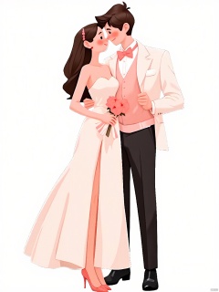 RWYS, A digital illustration of a couple standing close together, holding a bouquet of flowers. The woman has long, flowing brown hair and is wearing a strapless white dress with a high slit, revealing one leg. She is holding the bouquet in her left hand and has a gentle smile on her face. The man has short brown hair styled upwards and is wearing a white tuxedo with a pink bow tie and pink shoes. He is looking at the woman with a loving expression. The background is plain white, making the couple the focal point. The art style is clean and polished, with soft shading and vibrant colors.