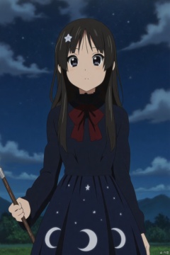 Black hair, long hair, a dark blue starry sky-themed dress, with twinkling stars and moon patterns on the skirt, as if in the Milky Way, wearing a small star-moon hair accessories, holding a magic wand, the background is the night sky and meteors, dreamy and mysterious, The eyes are full of expectations