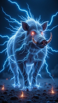 A robust wild boar is wrapped in furious lightning. Its originally coarse bristles have now transformed into flickering and leaping electric currents. Blue - white electric lights wander wantonly along its body, outlining the lines of its well - muscled physique. Its two sharp tusks glisten with a cold, harsh light in the thunder - light, and electric sparks occasionally burst at the tips of the tusks. Its ears stand erect, like two electrified blades. Every time it swings them, there is a hissing sound of electric current in the air. The eyes of the boar burn with red thunder - flames, full of wildness and anger. It rampages across the barren wilderness. Wherever it goes, the ground is split into charred gullies by the lightning, and the surrounding air vibrates violently due to its fury.