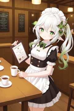 aritst:tinkle,tinkle,cxnice3,lolisugerjio,cxbackground,masterpiece,best quality, high quality, loli,1girl, solo, hair ornament, elf girls,pointy_ears, small breast,green eyes, symbol-shaped pupils, cross-shaped pupils, white hair, green hair, bangs, hair ornament, gradient hair, side tonytail, nahida \(genshin impact\),indoors,restaurant,cafe,maid,white headwear,maid outfit,black dress,white apron,standing,holding,holding menu,smile,torticollis,wooden room,tables,light,cups on table,