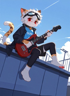 core_9, score_8_up, score_7_up,[16s],by niji6, [young furry boy,young_furry], cute furry character, holding a guitar, thick paint style, soft glow and ambient lighting, detailed background, soft shading, creative sketch papers around, light and atmospheric, expressive eyes, Japanese illustration style, cat boy,1boy,solo,male_focus,(white_hair:0.8),red eyes,[bell on collar,Collar,Cortical collar,Large collar],(blue t-shirt,black_leggings under shorts,black bike_shorts),(barefoot) BREAK dutch angle,vanishing point,sitting on rooftop,(blue sky,cloud,wind),(masterpiece, best quality:1.1),foot focus,goggles on head,bandage on nose,bandage on leg,Tail decoration,cat tail,Open coat,bare,body fur,anthro,