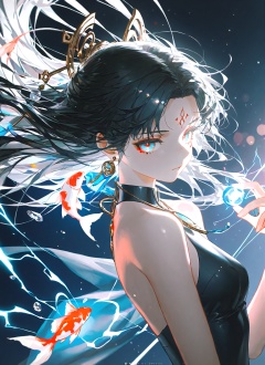 1girl,solo,long hair,looking at viewer,black hair,hair ornament,bare shoulders,jewelry,upper body,earrings,from side,floating hair,facial mark,fish,forehead mark,koi,depth of field,light particles,lens flare,(artist:quasarcake:0.8),extreme aesthetic,(wlop:0.6),wanke,rella,wanke,masterpiece,best quality,good quality,newest,year 2024,year 2023,very aesthetic,absurdres,Visual impact,Electromotive force,perspective composition,A shot with tension,ultra-high resolution,32K UHD,sharp focus,best quality,masterpiece,Emotionalization masterpiece,unconventional supreme,masterful details,with a high end texture,in the style of fashion photography,(Visual impact:1.2),giving the poster a dynamic and visually striking appearance,impactful picture,offcial art,colorful,splash of color,movie perspective,masterpiece,best quality,amazing quality,very aesthetic,absurdres,best quality,newest,qxsy,