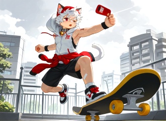 (artist:beitemian:0.67),(artist:rinotuna:0.93),masterpiece,best quality,very aesthetic,high resolution,ultra-detailed,absurdres,newest,scenery,1boy,male,solo,tsuguxl,red eyes,wristband,(((sleeveless hoodie,hood up),baseball cap,clothes_around_waist,shorts),bodysuit,red cap),white_hoodie,((one eye half-closed)),concentrating,open mouth,skateboarding,muscles,big pecs,pectorals,vein,sweat,sweatdrop,outside,park,cloudy sky BREAK depth of field,masterpiece,best quality,scenery,volumetric lighting,body fur,furry,emotionless eyes,white fur,cat boy,white hair,Right mid length drooping frontal hair,(Asymmetric hair on the temples:1.2),Expose left shoulder,wristband,thick eyebrows,barcode tattoo,bell on collar,Collar,Cortical collar,Large collar,white hair,bandage on nose,bandage on leg,<lora:影灵:0.25>,