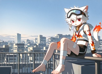 [nekowuwu],solo,male_focus,white hair,short hair,red eyes,floppy ears,fire arm tattoo,ski goggles,fire print on white (sleeveless) hoodies,crop top,black shorts,barefoot,three-quarter view,outdoor,rooftop,rains,sitting on railing,opened mouth,solo,very awa,masterpiece,best quality,highres,absurdres,emotionless eyes,white fur,cat boy,white hair,Right mid length drooping frontal hair,(Asymmetric hair on the temples:1.2),Expose left shoulder,wristband,thick eyebrows,barcode tattoo,bell on collar,Collar,Cortical collar,Large collar,white hair,bandage on nose,bandage on leg,furry,<lora:影灵:0.55>,