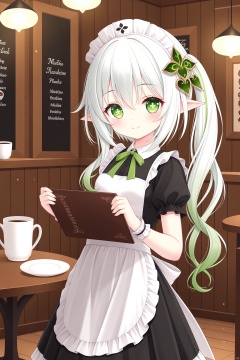 aritst:tinkle,tinkle,cxnice3,lolisugerjio,cxbackground,masterpiece,best quality, high quality, loli,1girl, solo, hair ornament, elf girls,pointy_ears, small breast,green eyes, symbol-shaped pupils, cross-shaped pupils, white hair, green hair, bangs, hair ornament, gradient hair, side tonytail, nahida \(genshin impact\),indoors,restaurant,cafe,maid,white headwear,maid outfit,black dress,white apron,standing,holding,holding menu,smile,torticollis,wooden room,tables,light,cups on table,