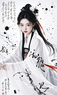jinghongzy,1girl,solo,long hair,looking at viewer,black hair,hair ornament,dress,ribbon,jewelry,upper body,flower,earrings,hair flower,hair bun,black,eyes,chinese clothes,single hair bun,hanfu,Ink and wash,Chinese character