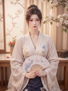 The image depicts a person dressed in traditional Japanese attire, specifically a kimono, sitting at a low table. The kimono is predominantly white with gold and blue floral patterns. The person is holding a round, hand-held fan with a design featuring a white bird and some colorful elements.