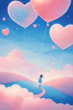 valentinesday,of a vibrant digital illustration,AYU,Artistic illustration,In the center, a delicate, intricately textured heart-shaped pink balloon, composed of soft, wispy cotton threads, floats effortlessly against a serene backdrop of a lush, vibrant meadow, painted in a pastel blue and muted Morandi color palette with subtle, nuanced brushstrokes. Fluffy cotton sheep graze peacefully, their gentle movements blurred, amidst the meadow's feathery grasses. Above, a delicate blue sky is adorned with intricately detailed, shimmering ribbons and tiny, sparkling stars that twinkle softly. Pink clouds, with wispy, feathery edges, rest on the ground, adding to the dreamy, enchanting atmosphere. The scene is captured in exquisite, hyper-realistic detail, with a wide, sweeping landscape shot that showcases the rolling, puffy cumulus clouds in the distance, creating a tranquil, mesmerizing vista.