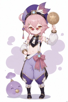 tsubasachyan,cxnice3,lolisugerjio,masterpiece,best quality, high quality, loli,1girl, solo, looking at viewer, smile, short hair, bangs, simple background, shirt, hair ornament, long sleeves, hat, white background, navel, holding, hair between eyes, bare shoulders, closed mouth, standing, full body, pink hair, sidelocks, boots, detached sleeves, glasses, sleeveless, midriff, puffy sleeves, pants, virtual youtuber, black footwear, crop top, black shirt, sleeveless shirt, sunglasses, tassel, two-tone background, puffy long sleeves, white sleeves, round eyewear, purple headwear, tinted eyewear, baggy pants, pince-nez, purple pants, looking over eyewear, puffy pants,newest,vision (genshin impact),dori (genshin impact),