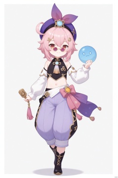 tsubasachyan,cxnice3,lolisugerjio,masterpiece,best quality, high quality, loli,1girl, solo, looking at viewer, smile, short hair, bangs, simple background, shirt, hair ornament, long sleeves, hat, white background, navel, holding, hair between eyes, bare shoulders, closed mouth, standing, full body, pink hair, sidelocks, boots, detached sleeves, glasses, sleeveless, midriff, puffy sleeves, pants, virtual youtuber, black footwear, crop top, black shirt, sleeveless shirt, sunglasses, tassel, two-tone background, puffy long sleeves, white sleeves, round eyewear, purple headwear, tinted eyewear, baggy pants, pince-nez, purple pants, looking over eyewear, puffy pants,newest,vision (genshin impact),dori (genshin impact),