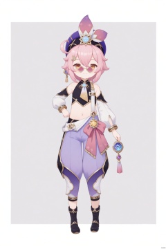 tsubasachyan,cxnice3,lolisugerjio,masterpiece,best quality, high quality, loli,1girl, solo, looking at viewer, smile, short hair, bangs, simple background, shirt, hair ornament, long sleeves, hat, white background, navel, holding, hair between eyes, bare shoulders, closed mouth, standing, full body, pink hair, sidelocks, boots, detached sleeves, glasses, sleeveless, midriff, puffy sleeves, pants, virtual youtuber, black footwear, crop top, black shirt, sleeveless shirt, sunglasses, tassel, two-tone background, puffy long sleeves, white sleeves, round eyewear, purple headwear, tinted eyewear, baggy pants, pince-nez, purple pants, looking over eyewear, puffy pants,newest,vision (genshin impact),dori (genshin impact),