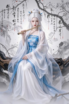 Prompt: 1girl, solo, long hair, hair ornament, dress, sitting, white hair,, white dress, tree, blue dress,,Flute, flute,hanfu,Ink and wash, Chinese characters,Surrealism, fantasy, smoke,