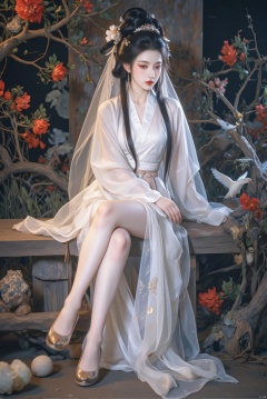 1girl, solo, long hair, bangs, black hair, hair ornament, long sleeves, dress, sitting, closed mouth, flower, barefoot, wide sleeves, white dress, bare legs, bird, chinese clothes, red flower, veil, branch