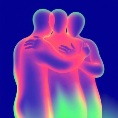 mili,This image is a digital abstract art piece depicting three semi-transparent, glowing human figures intertwined against a deep blue background. These figures are presented in neon colors such as green, orange, and pink, creating a sense of warmth and intimacy. The figures have soft, flowing contours with smooth curves, evoking a dreamlike and ethereal atmosphere. The neon hues blend seamlessly, highlighting the gentle connection between them. The style is modern and ethereal, focusing on light and color to convey emotions.