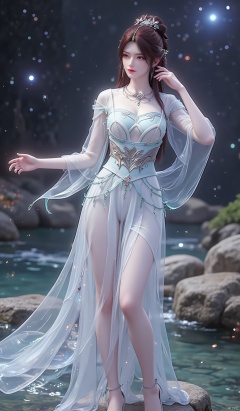 Standing on the banks of the star - river, her crystal dress spills stardust with every sway, as if she has captured the essence of the galaxy.