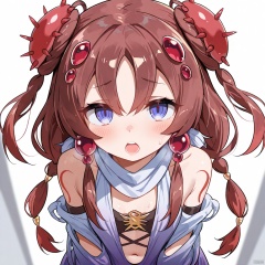 masterpiece, best quality, high quality, Traptrix Atypus \(ygo\), 1girl, solo, long hair, looking at viewer, open mouth, blue eyes, brown hair, hair ornament, navel, twintails, purple eyes, braid, detached sleeves,
