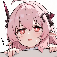 EmojiPack, 1girl, pink hair, pointy ears, horns, white background, pink eyes, long hair, simple background, solo, flying sweatdrops, open mouth, demon horns, hair between eyes, red eyes, peeking out, bangs, ahoge, sweatdrop, hair ornament