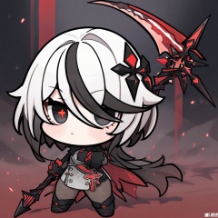 EmojiPack, 1girl, chibi, x-shaped pupils, solo, weapon, white hair, black hair, symbol-shaped pupils, holding, multicolored hair, scythe, black eyes, holding weapon, short hair, looking at viewer, bangs, red pupils, hair between eyes, streaked hair, gloves, closed mouth, coat