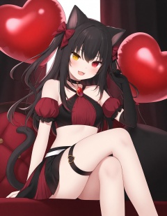 slit_pupils,amashiro_natsuki, CHARACTERS-Matsuri, 1girl, animal_ears, solo, choker, heterochromia, black_choker, gloves, skirt, cat_ears, bare_shoulders, long_hair, black_gloves, crop_top, red_eyes, hair_bow, thigh_strap, sitting, black_hair, heart_balloon, crossed_legs, yellow_eyes, bow, halterneck, looking_at_viewer, black_skirt, smile, hand_up, elbow_gloves, midriff, detached_sleeves, thighs, cat_girl, open_mouth, tail, short_sleeves, :d, miniskirt, cat_tail, balloon, shirt, puffy_sleeves, feet_out_of_frame, breasts, small_breasts, puffy_short_sleeves, criss-cross_halter, red_shirt, fangs, stomach, brooch, virtual_youtuber, asymmetrical_gloves, single_glove, two_side_up,masterpiece, best quality, newest, highres, absurdres, newest,