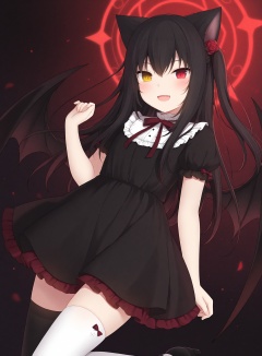 slit_pupils,amashiro_natsuki, CHARACTERS-Matsuri, 1girl, solo, dress, animal_ears, thighhighs, black_hair, short_sleeves, red_eyes, long_hair, black_dress, heterochromia, puffy_short_sleeves, puffy_sleeves, yellow_eyes, cat_ears, wings, magic_circle, hand_up, high_heels, standing_on_one_leg, smile, black_footwear, frills, white_thighhighs, blush, mismatched_legwear, asymmetrical_legwear, hair_ornament, looking_at_viewer, rose, hair_between_eyes, hair_flower, flower, red_flower, ribbon, very_long_hair, frilled_dress, red_ribbon, black_thighhighs, fang, open_mouth, parted_lips, standing, red_rose, cat_girl, one_side_up, demon_wings, :d, neck_ribbon, two_side_up, bat_wings,masterpiece, best quality, newest, highres, absurdres, newest,