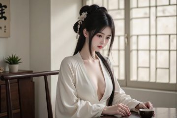 1girl, solo, long hair, black hair, hair ornament, long sleeves, upper body, day, indoors, wide sleeves, blurry, black eyes, lips, chinese clothes, realistic,breasts,cleavage,big breasts. sitting, tea table, tea cup, Chinese character wall, wide window.