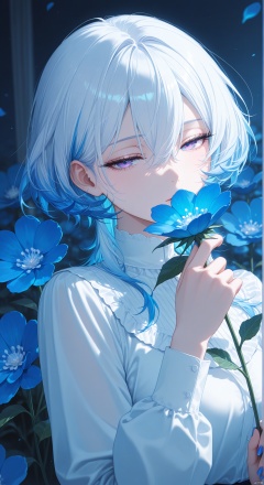 1girl, looking at viewer, holding a big blue flower, blue hair, white shirt, nail polish, purple eyes, blue eyes, eyelashes, long sleeves, white hair, hand up, hair between eyes, half-closed eyes, blue theme, cinematic composition, ultra-detailed, high-quality