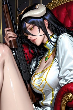 1girl, solo, long hair, breasts, bangs, large breasts, black hair, long sleeves, dress, holding, hair between eyes, jewelry, sitting, closed mouth, yellow eyes, weapon, horns, shiny, indoors, holding weapon, white dress, from side, lips, fingernails, gun, eyelashes, chair, demon girl, slit pupils, demon horns, gem, holding gun, rifle, knee up, nose, armchair, white horns, albedo \(overlord\),[keyword1 : Perfect face, complete features],score_9,score_8_up,score_7,kidmo,[artist: wlop],pastel colors,Realistic face,realistic skin,close-up,portrait,(Focus on the face:1.3),by araki hirohiko,jojo posture,by araki hirohiko,Role: Weather forecast