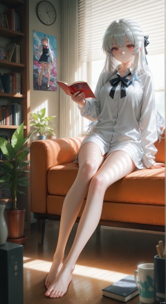 1girl, solo, long hair, looking at viewer, bangs, shirt, red eyes, long sleeves, bow, ribbon, holding, closed mouth, full body, hair ribbon, white shirt, white hair, hair bow, grey hair, food, barefoot, collared shirt, indoors, cup, book, bare legs, window, dress shirt, black bow, fruit, plant, open book, bookshelf, potted plant, blinds ,backlighting,depth of field,cinematic lighting,light particles,lens flare, (artist:quasarcake:0.8),extreme aesthetic,(wlop:0.6),masterpiece,best quality,good quality,newest,very aesthetic,absurdres,Visual impact,A shot with tension, ultra-high resolution,32K UHD,sharp focus,best-quality,masterpiece,Emotionalization,unconventional supreme masterpiece,masterful details,temperate atmosphere,with a high-end texture,in the style of fashion photography, (alzi xiaomI:1.2),(mogumo:1.1),(good hands, nice hands:0.5),giving the poster a dynamic and visually striking appearance,impactful picture,offcial art,colorful,movie perspective, masterpiece,best quality,amazing quality,very aesthetic,absurdres,best quality,newest