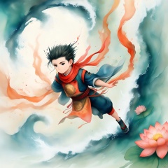 In a scene set on the turbulent, wave-tossed sea, a young boy stands as a reimagined version of the Chinese mythological figure Nezha. He has one head and six arms, each arm poised in a dynamic pose. His appearance is inspired by ancient Chinese mythology, with a red lotus-shaped Hunkuntin scarf around his neck, fluttering gracefully. Around his waist, he wears a lotus-patterned apron, and his clothing is adorned with intricate lotus designs. His hair flows upward, defying gravity, adding to the ethereal and powerful aura. The composition is simple yet striking, capturing the essence of Nezha's legendary presence.