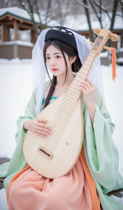 The image shows a young woman sitting on a wooden bench in a snowy landscape. She is wearing a traditional Japanese kimono in a light green color with orange accents. The woman is also wearing a black hat with a wide brim and a white veil covering her head. She has long dark hair and is holding a stringed instrument, which appears to be a mandolin, in her hands. The mandolin is resting on her lap and she is looking off to the side with a serious expression on her face. In the background, there are trees and a wooden structure covered in snow. The overall mood of the image is peaceful and serene.