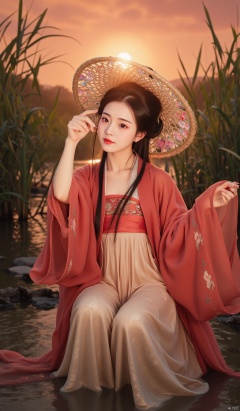 In the evening, the reeds by the stream sway in the gentle breeze. The sunset dyes the sky orange - red, and the afterglow shines on the water, glistening. The beauty in Hanfu is squatting by the stream, stretching out her hand to gently touch the water, creating circles of ripples. She is wearing a crimson Qiyao Zhequn with wave patterns embroidered on the skirt. The Floral Deity's Straw Hat on her head is woven with bright colors into vivid fish patterns, echoing the glistening waves on the water. Her hair is fluttering in the wind, and she is like a beautiful sunset picture.