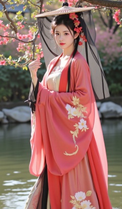 By the rockeries in the garden, the spring water shimmers. The woman is wearing a vermilion - colored Qixiong Ruqun, with golden peonies embroidered on the skirt. She has an outer shawl of the same color made of thin brocade. She wears a bamboo hat adorned with red flowers, and black gauze hangs down. Her eyes are bright and expressive as she stands under the flower - laden tree, looking strikingly beautiful.