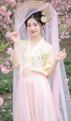 Deep in the peach orchard, the falling petals are in profusion. The woman is wearing a light - yellow front - buttoned short - shirt, paired with a light - pink pleated skirt, on which butterflies are embroidered. She wears a bamboo hat adorned with yellow flowers, and pink gauze covers her face. She gently pinches a peach blossom with one hand, smiling charmingly and sweetly.