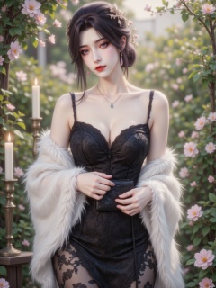 She is wearing a black lace dress with thin straps, which is complemented by a luxurious white fur stole draped over her shoulders. The dress has a deep V-neckline, and she is holding a small black clutch in her right hand. Around her neck, she wears a delicate necklace with a pendant.