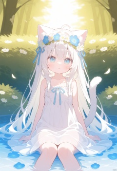 1girl, solo, long hair, looking at viewer, blush, bangs, blue eyes, hair ornament, dress, ribbon, animal ears, hair between eyes, bare shoulders, sitting, very long hair, collarbone, tail, flower, ahoge, white hair, outdoors, parted lips, sleeveless, day, cat ears, hair flower, water, white dress, :o, tree, wet, cat tail, animal ear fluff, bare arms, petals, sleeveless dress, feet out of frame, white flower, blue ribbon, cat girl, blue flower, head wreath, tail raised, flower wreath, shallow water