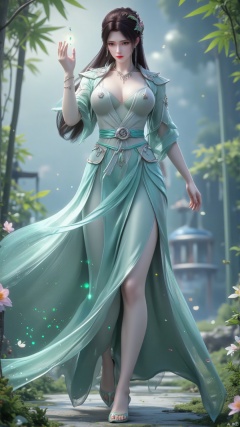 The overall image is dominated by emerald green and silver, with the gown's particle light in soft fluorescent green, soft light spots filtering through bamboo leaves, wind-blown bamboo leaves in pale green, and flowers in soft pink-purple.