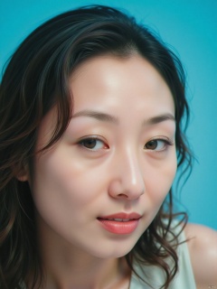Soft focus on a ravishing woman's face,Side-swept curls, capturing every detail of her porcelain-like skin. The Kodak camera captures the subtle play of light and shadow across her features, accentuating the gentle curves of her cheeks and the delicate shape of her eyes. Her full face fills the frame, inviting the viewer to linger on her alluring expression.
